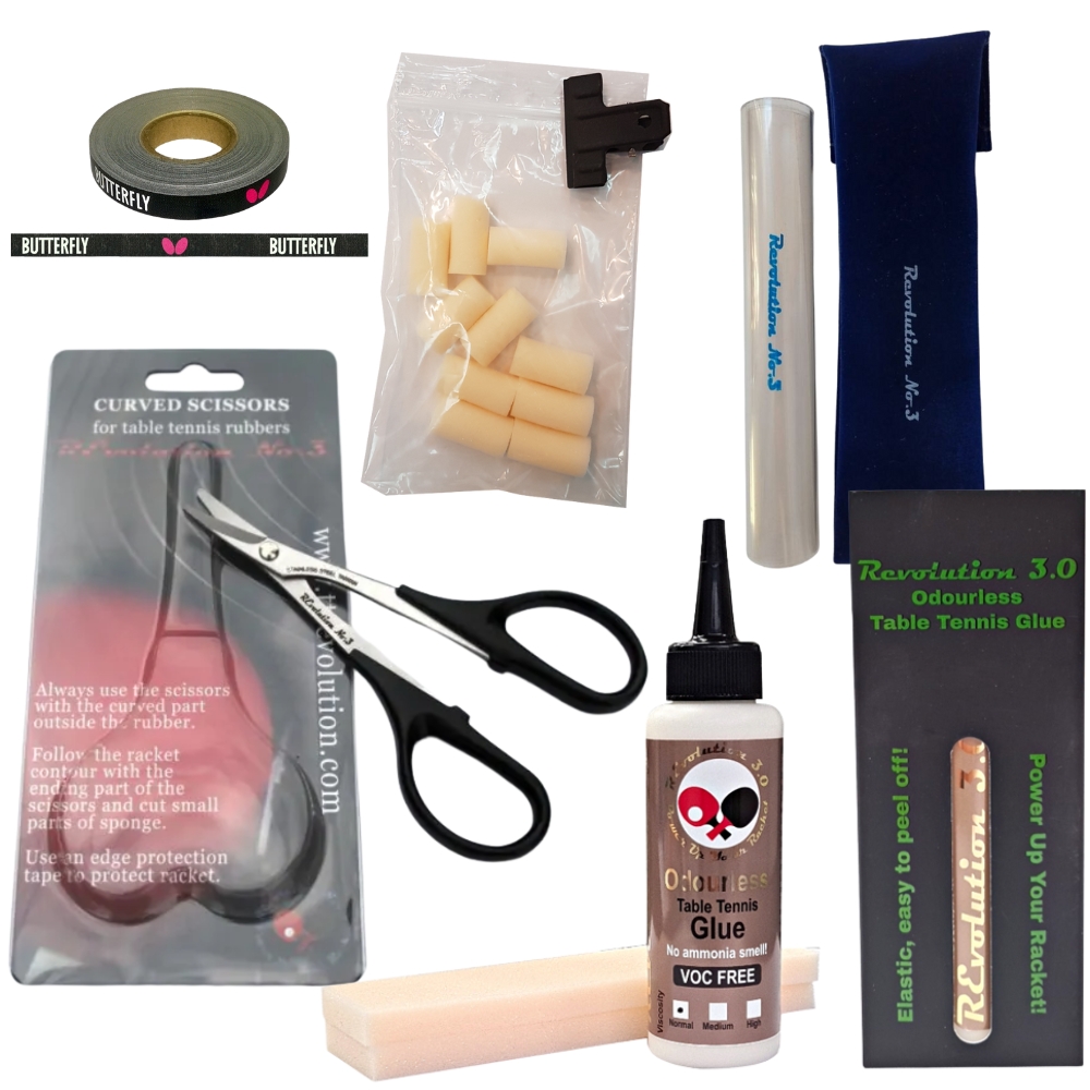 ZESTAW DO KLEJENIA OKŁADZIN DO TENISA STOŁOWEGO KLEJ + ROLLER + NOŻYCZKI + PASEK + GĄBKI
