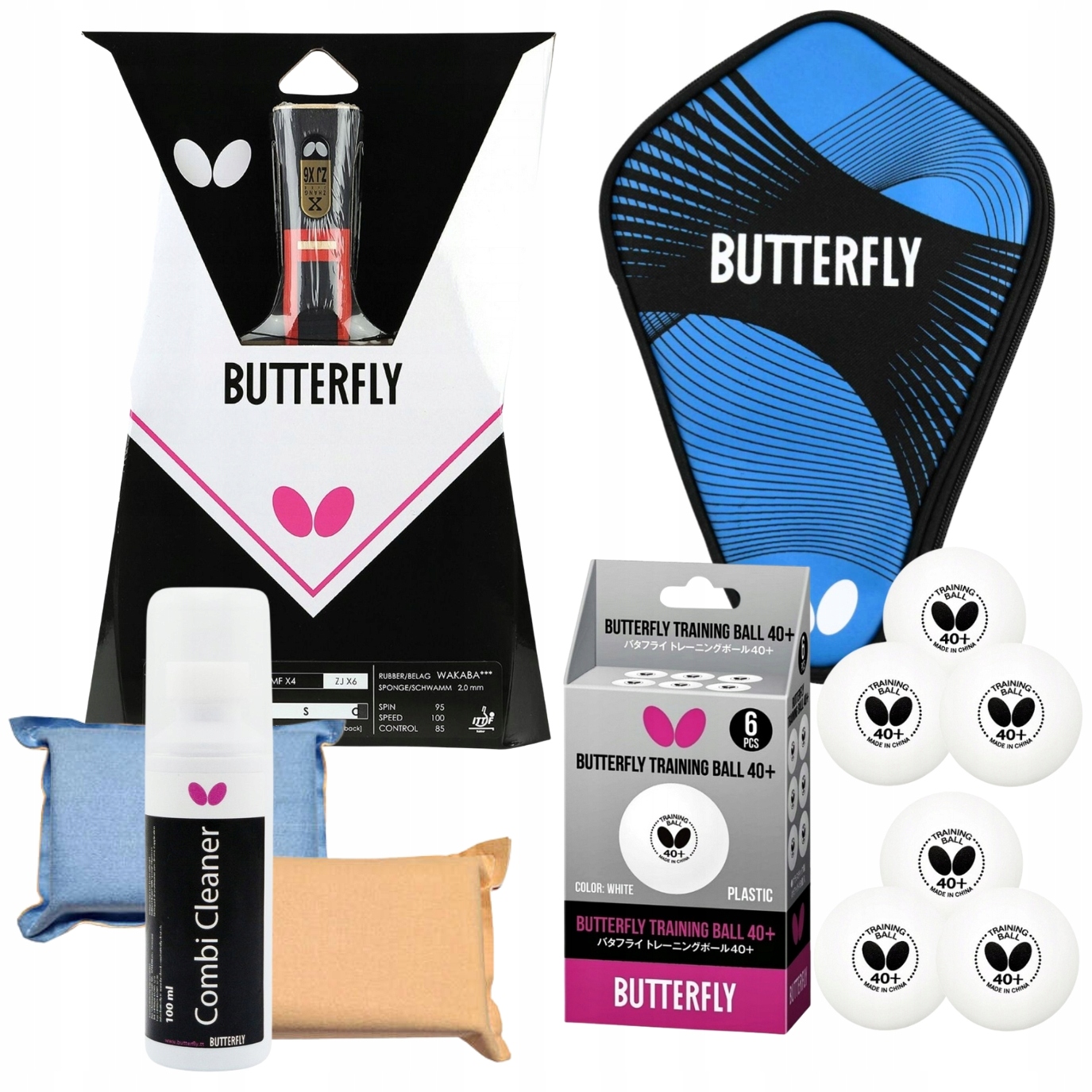 ZESTAW RAKIETKA DO TENISA STOŁOWEGO ZAWIERA RAKIETKĘ BUTTERFLY ZHANG JIKE, POKROWIEC BUTTERFLY CURVE CASE I, PIŁECZKI BUTTERFLY 6 sztuk, PŁYN do czyszczenia BUTTERFLY + GĄBKA DWUSTRONNA