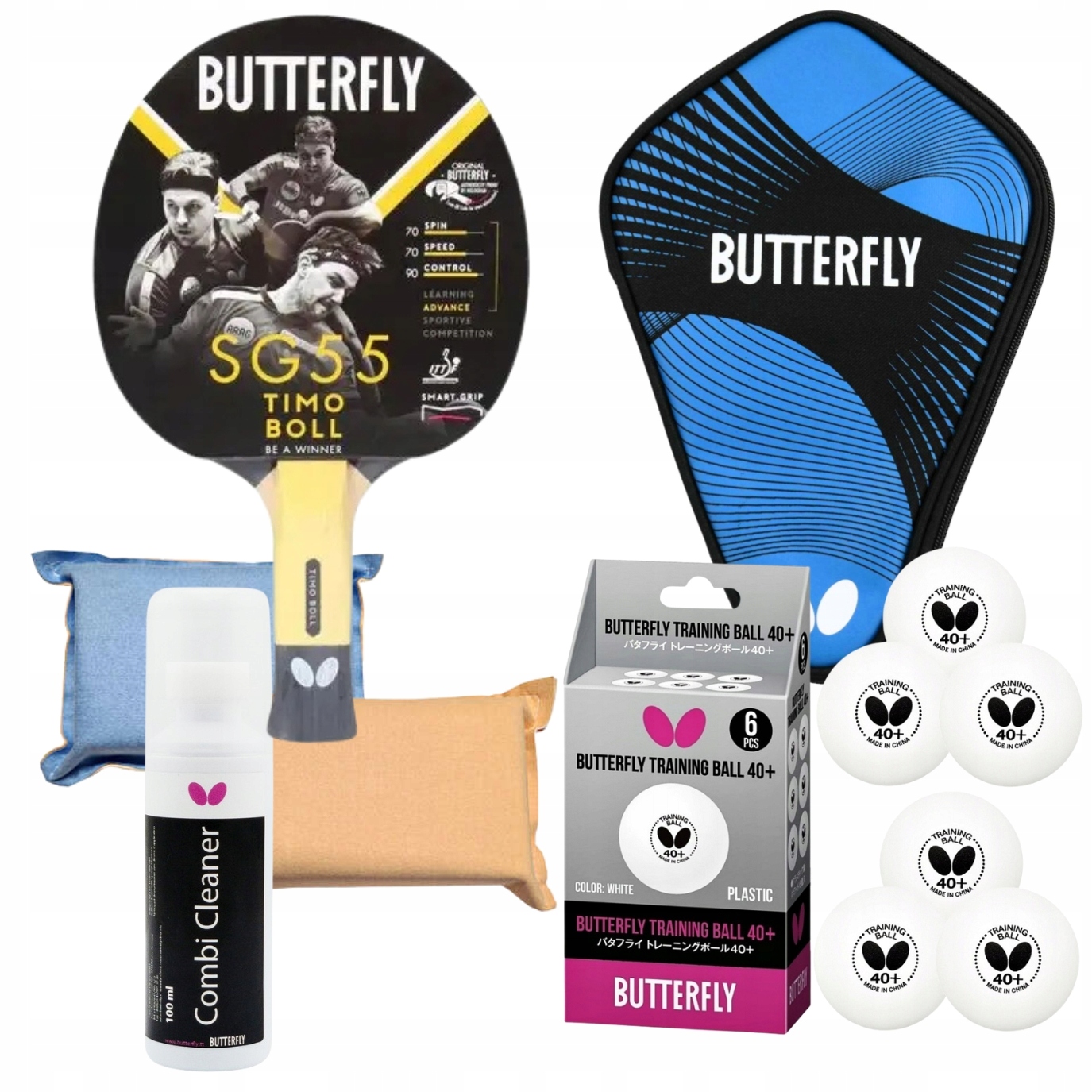 ZESTAW RAKIETKA do TENISA STOŁOWEGO BUTTERFLY TIMO BOLL SG55, PIŁECZKI BUTTERFLY 6 sztuk, PŁYN do czyszczenia BUTTERFLY + GĄBKA DWUSTRONNA